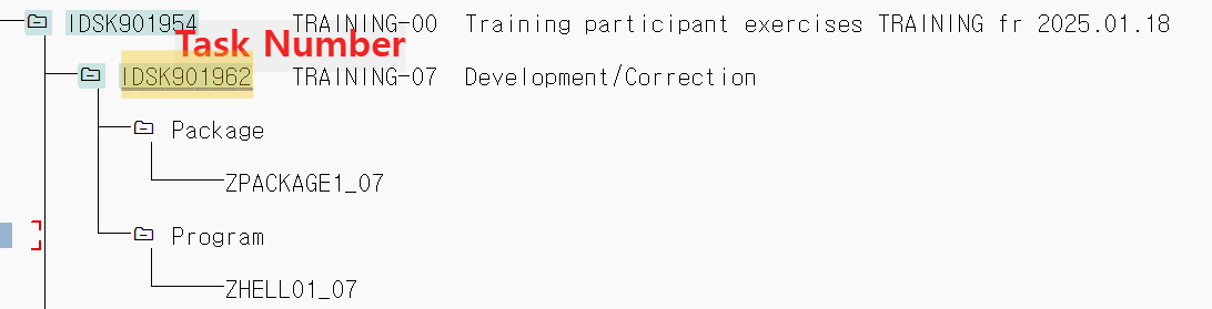 - ZPACKAGE1_07(ํจํค์ง) ๋๋ ZHELLO1_07(ํ๋ก๊ทธ๋จ) ๊ฐ์ ๊ฐ์ฒด ์์ฒด์๋ Task Number๊ฐ ์ง์ ๋ณด์ด์ง ์์ง๋ง, ์ด ๊ฐ์ฒด๋ค์ด Task Number๋ฅผ ํตํด ๊ฐ์ ์ ์ผ๋ก ๊ด๋ฆฌ๋ฉ๋๋ค.