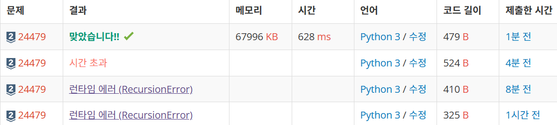 Python์ ๊ธฐ๋ณธ ์ฌ๊ท ์ ํ์ ์ฝ 1000 ์ ๋๋ก, sys.setrecursionlimit์ ์ค์ ํ์ง ์์ผ๋ฉด ํฐ ์ ๋ ฅ์ ์ฒ๋ฆฌํ๋ ๊ณผ์ ์์ ์ฌ๊ท ํธ์ถ์ด ์ ํ์ ์ด๊ณผํ์ฌ ๋ฐํ์ ์๋ฌ๊ฐ ๋ฐ์ํ ์ ์๋ค.