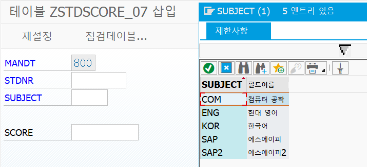 Foreign Key๋ฅผ ์ค์ ํ๋ฉด Text Table์์ ๊ณผ๋ชฉ ์ฝ๋๊ฐ ๋ฌด์กฐ๊ฑด ZSTDSUBJECT_07์ ์กด์ฌํ๋ ๊ฐ๋ง ์